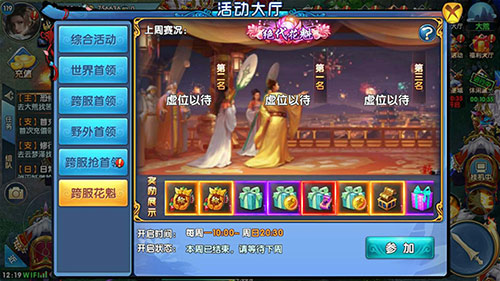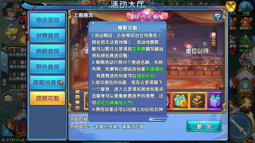 《紫青双剑》中打开活动大厅,进入“跨服花魁”就可以参与到花样女神的比赛当中,花魁活动的开启是每周一的10:00至周日的20:30时间十分的充裕。在此期间,女性角色都可以积极的前往云梦泽赵花芙蓉填写基础资料报名,你离成为女神又更一步咯~