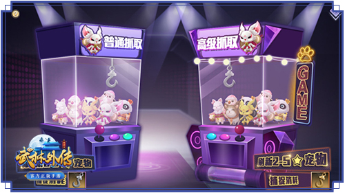 在江湖历练不能做独行侠!快来抓一个专属的宠物带在身边吧,赶都赶不走的那种~除了任务奖励外,各位少侠还可以在娃娃机里抓取调皮的小可爱。两种抓取方式,多种品质星级的宠物在池中等待着主人的到来~