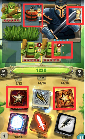 骰子的剑、盾两种花色分别负责攻击和防御,而星星和闪电则负责消灭一些特殊的敌人。随着关卡的不断推进,游戏中会出现许多有趣的道具和强大的敌人。如下图的骑士,这个敌人拥有五层护甲,需要五个剑的花色才能将其护甲破除,但是如果玩家能同时投掷出两个闪电,则可以直接摧毁其护甲。炸药桶堪称游戏中的“双刃剑”,如果不能及时摧毁,就会对玩家造成大量的伤害,不过如果玩家能投掷出两颗星星,则能使它爆炸,对周围敌人造成伤害。因此,如果你够“欧”,说不定根本不需要动手,光靠炸弹就能消灭许多强大的敌人。